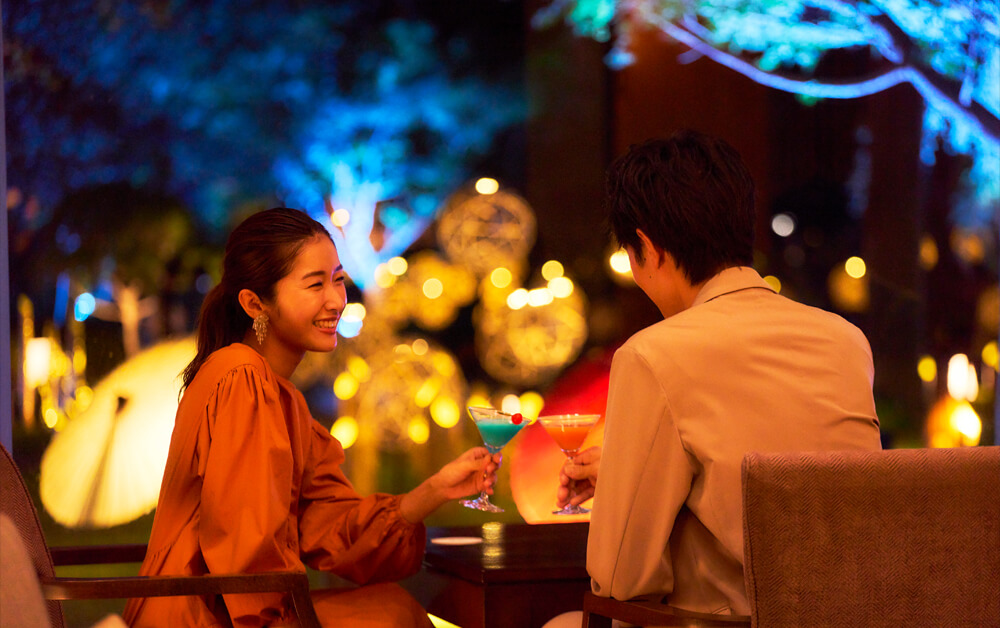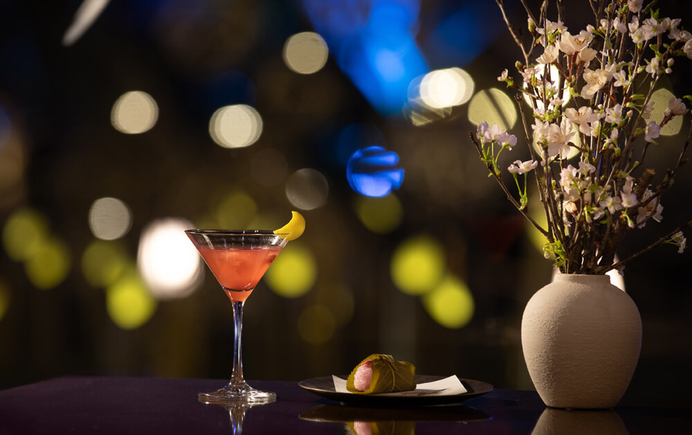 春の月待ちラウンジ - 窓一面に広がる桜を眺めながら月待ち体験を。ラウンジ 光明では、桜をイメージした日本酒カクテルと春にぴったりな桜餅をお楽しみいただけます。