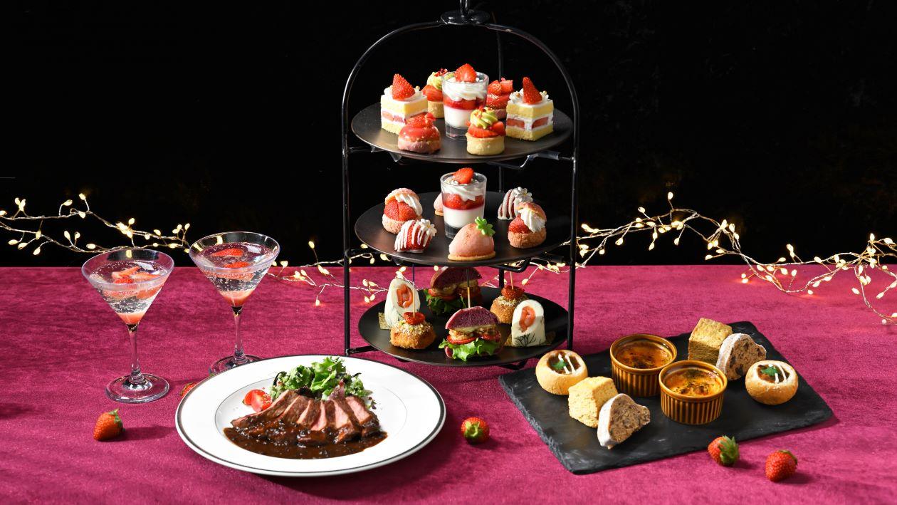 きらめく日本庭園のライトアップを窓に望むラウンジで、フレンチシェフ考案のクリスマスディナー全4品を楽しむ優雅なひととき。