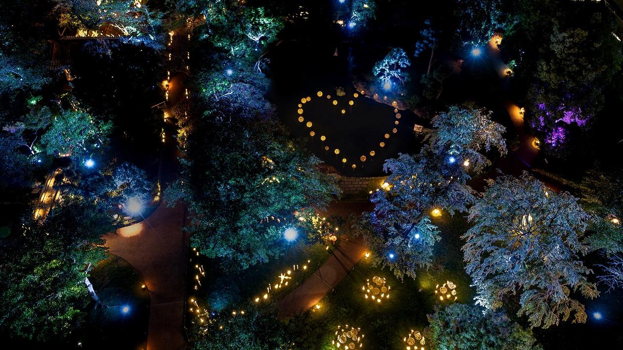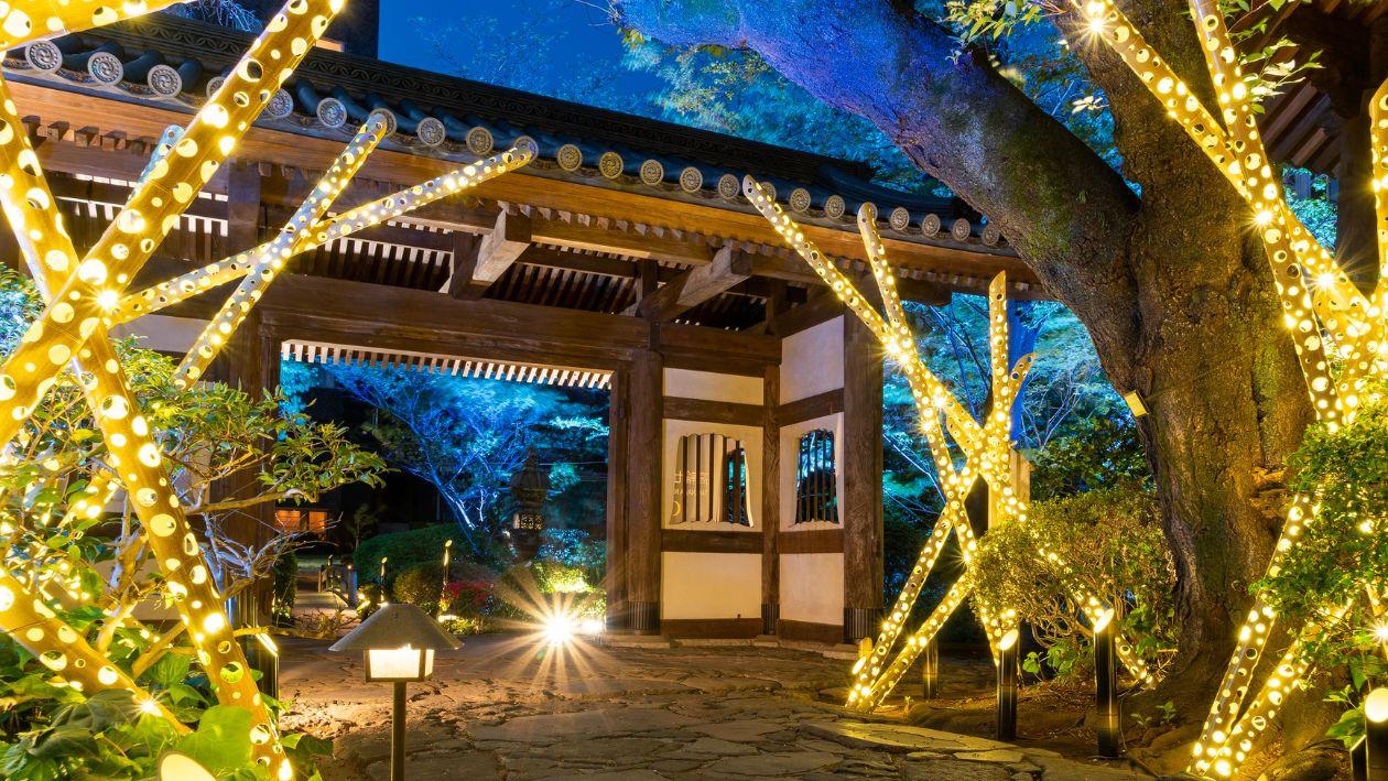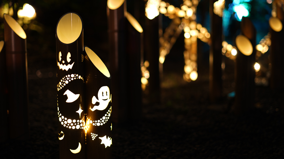 月が海から出る様を待つ様子を再現した波のデザインや、港区有形文化財に指定されている歴史的建造物と調和する黒竹を使用したデザイン、歩みを進めるごとに四季の移ろいを感じていただける日本庭園の四季をイメージしたデザインなど、400を超える竹あかりできらめきに満ちた高輪時間をお届けしております。
