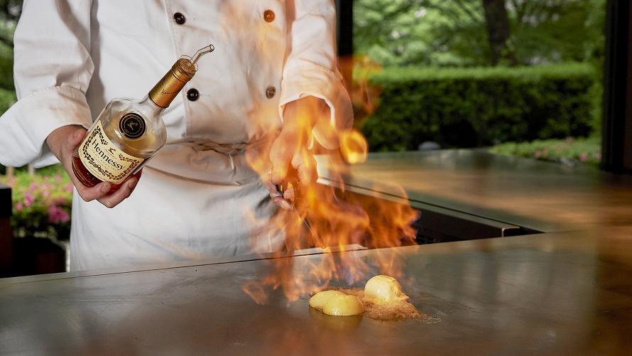 バニラアイスとフルーツを鉄板の上でフランベしてお皿に盛り付け、アングレーズソースやフルーツソースを添えるプラン限定のデザート。