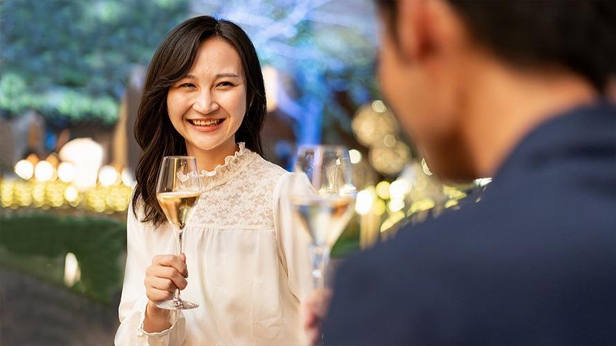 煌めく夜景を望む空間で、グラスシャンパンで華やかに乾杯。