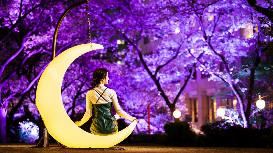 ライトアップされた幻想的な庭園に佇む月の形をしたチェアでゆったりと。