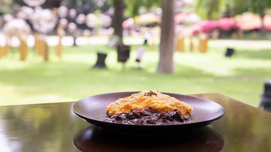 ふわふわとろとろな半熟卵のオムライスを、国産牛のすじ肉の旨味が溶け込むソースとともにお召しあがりください。