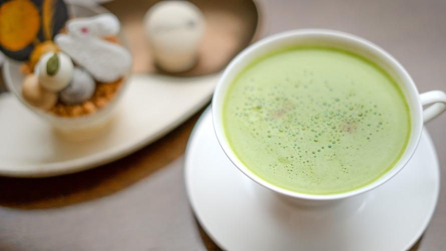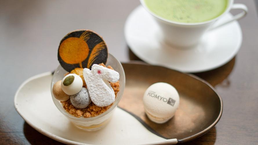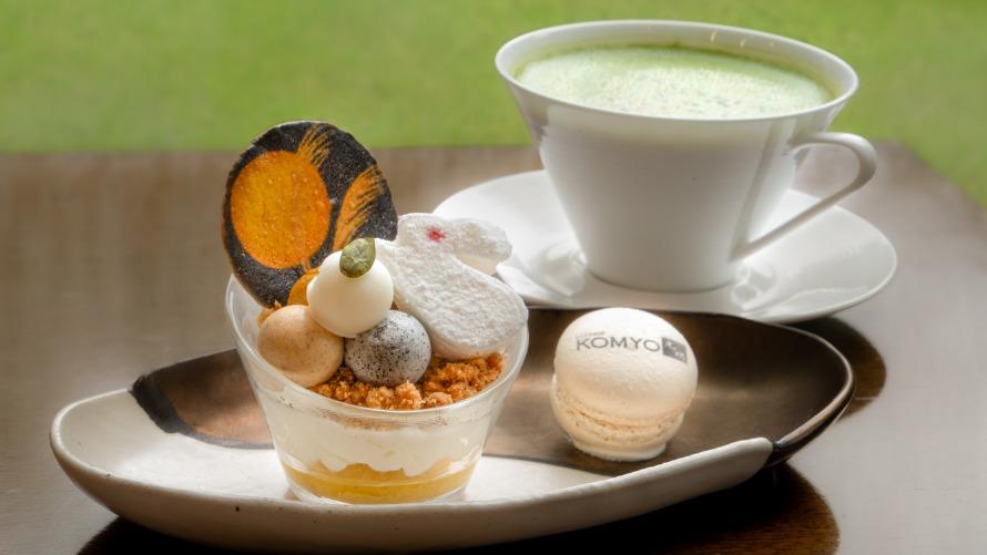 月待ちの情景を映したスイーツと抹茶カフェラテのセットをお楽しみいただけます。