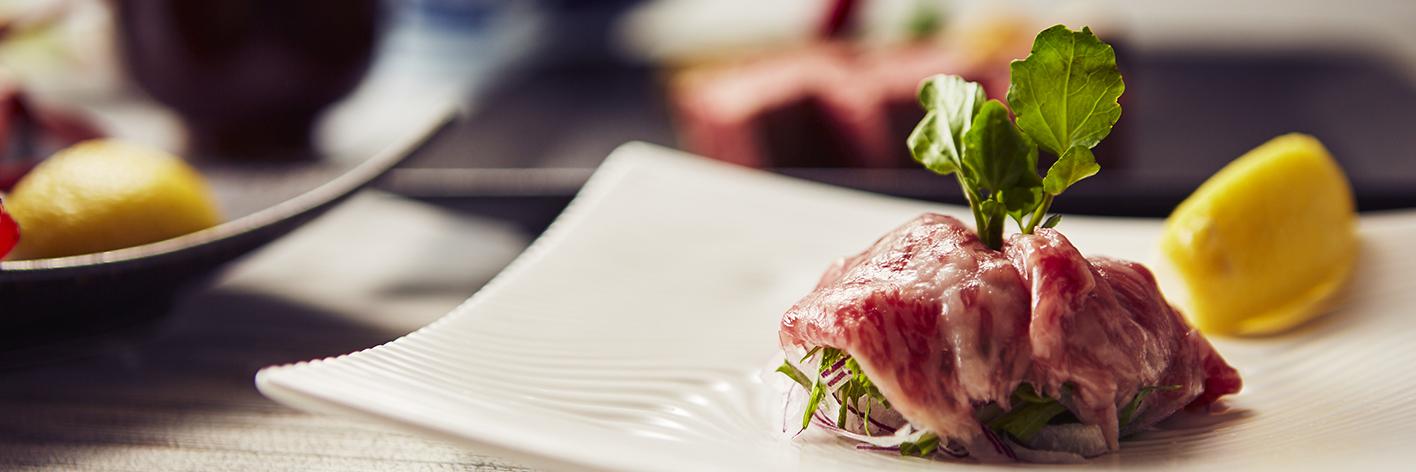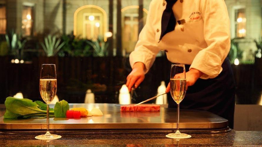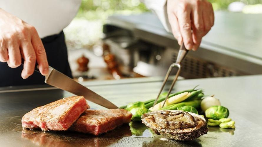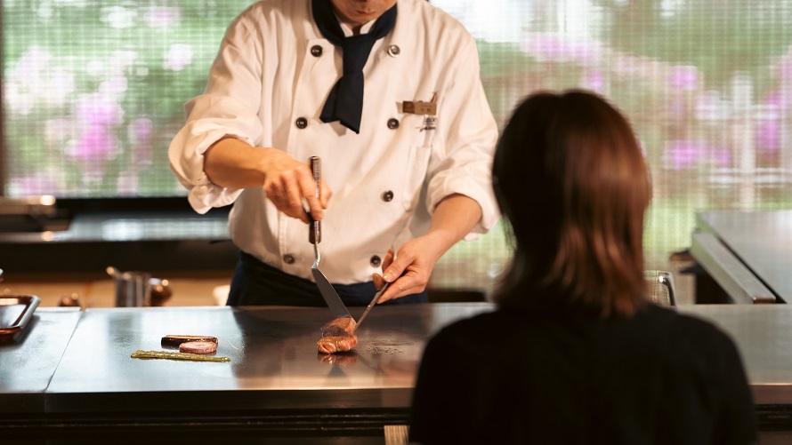 銘柄牛や山海の幸の、臨場感あふれる鉄板焼をお楽しみいただけます。庭園の中にたたずむ落ち着いた空間で、美食のひとときをご堪能ください。