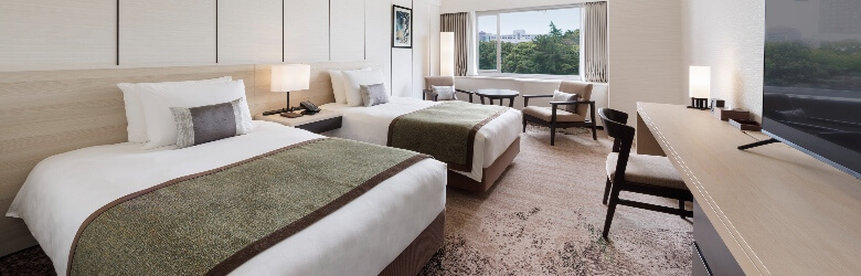 窓から自然豊かな日本庭園を望む、ゆったりとお過ごしいただけるツインルーム。