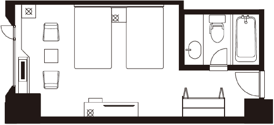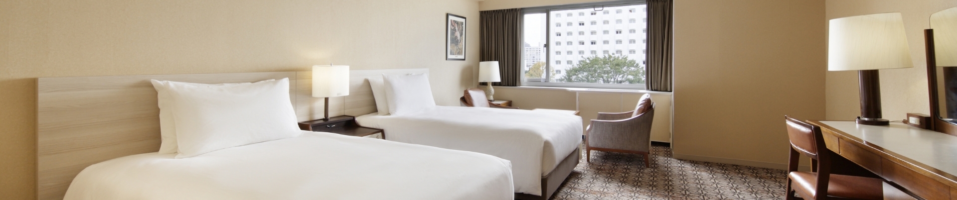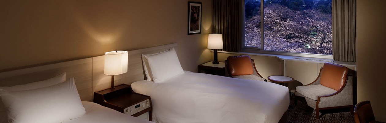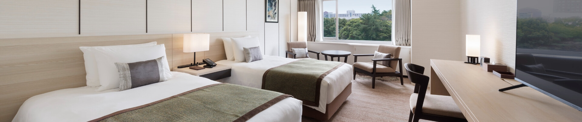 窓から自然豊かな日本庭園を望む、ゆったりとお過ごしいただけるツインルーム。