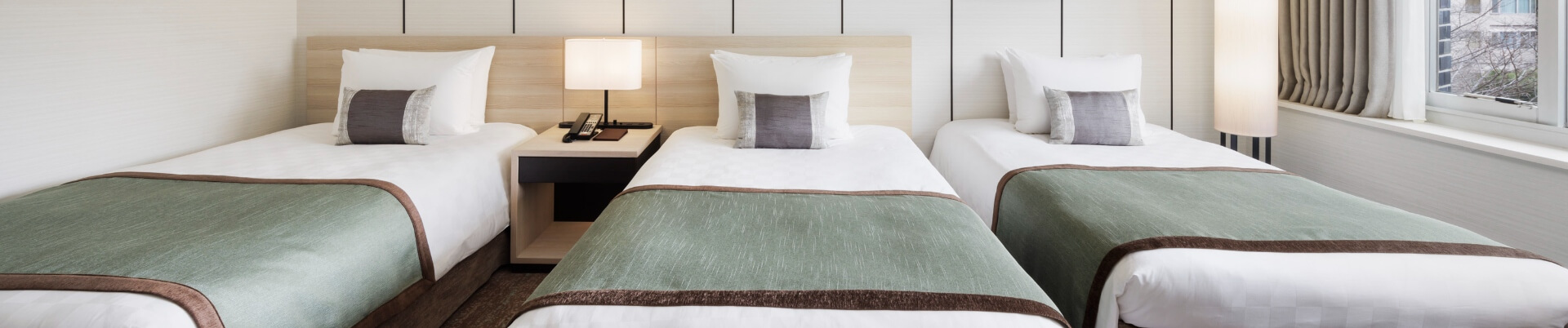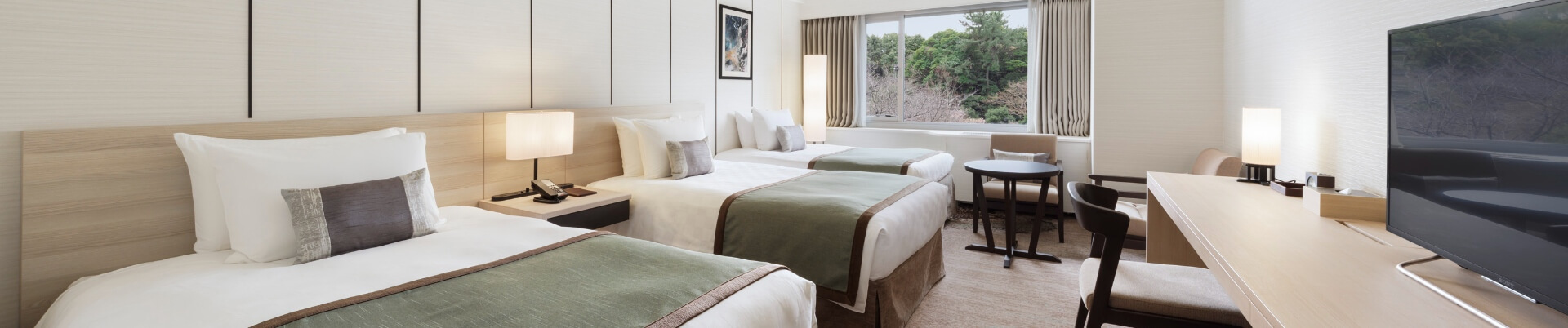 窓から自然豊かな日本庭園を望む、ゆったりとお過ごしいただけるトリプルルーム。