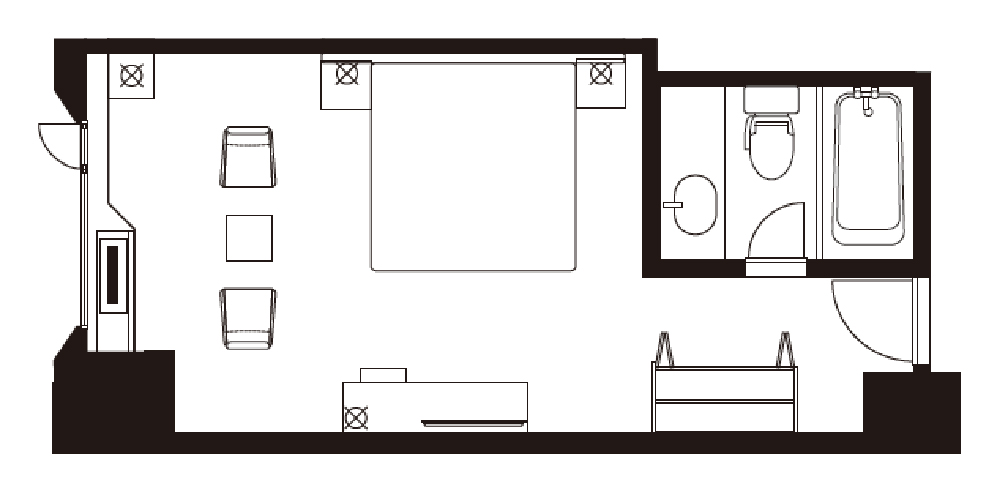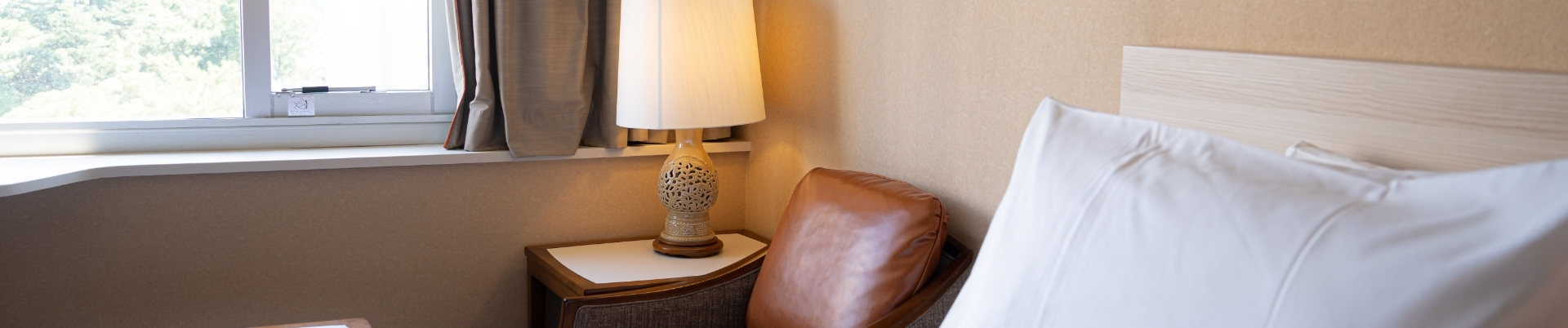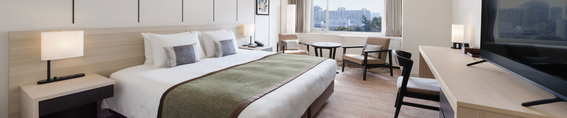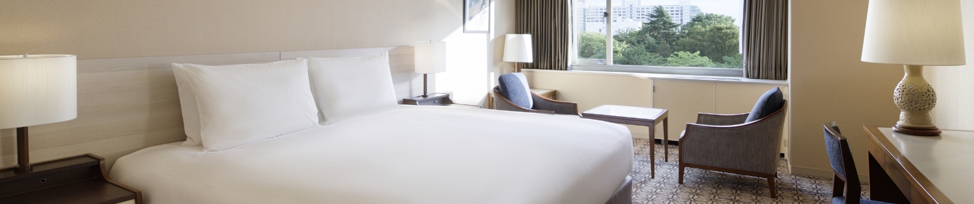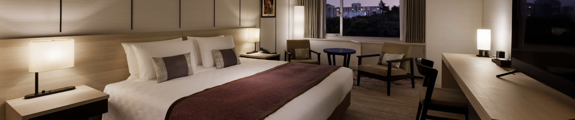 窓から自然豊かな日本庭園を望む、ゆったりとお過ごしいただけるキングルーム。