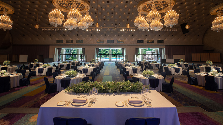 ベージュの壁に金の装飾が美しい、100年を超える歴史を紡いできた明治の洋館、「貴賓館」のメインバンケット。フランス・バロック調の空間にヴィンテージ感あふれる調度品が揃います。ロイヤルウエディングさながらの結婚式やアットホームな家族での会食まで、ご希望に沿ったスタイルをご提案します。