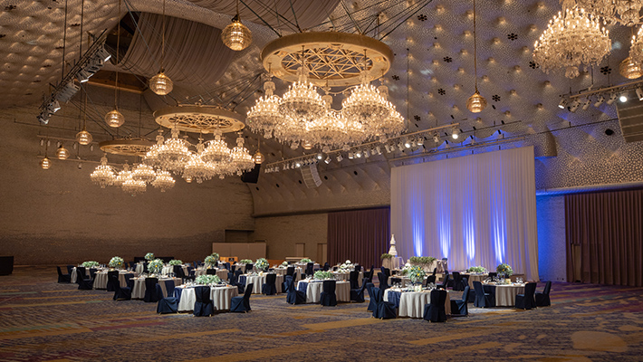 高い天井に壮麗なデザインがスタイリッシュな空間では、フラワーアレンジもダイナミックな演出が可能。またプロジェクションマッピングもご用意。