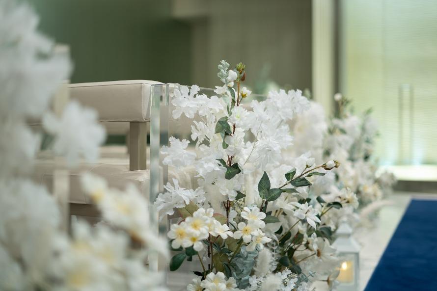 純粋さや美しさ、高貴さを表現する飾花があしらわれ、凛とした洗練された空間が、おふたりの晴れ姿をより一層美しく引き立たせます。