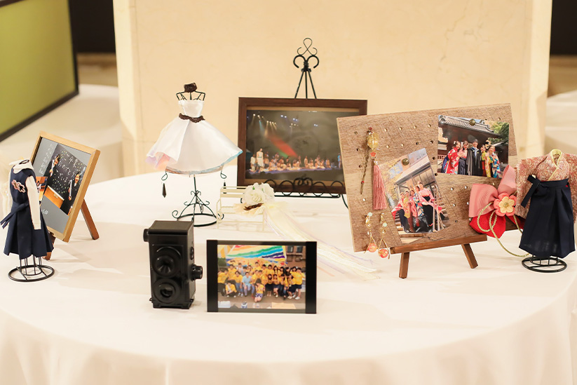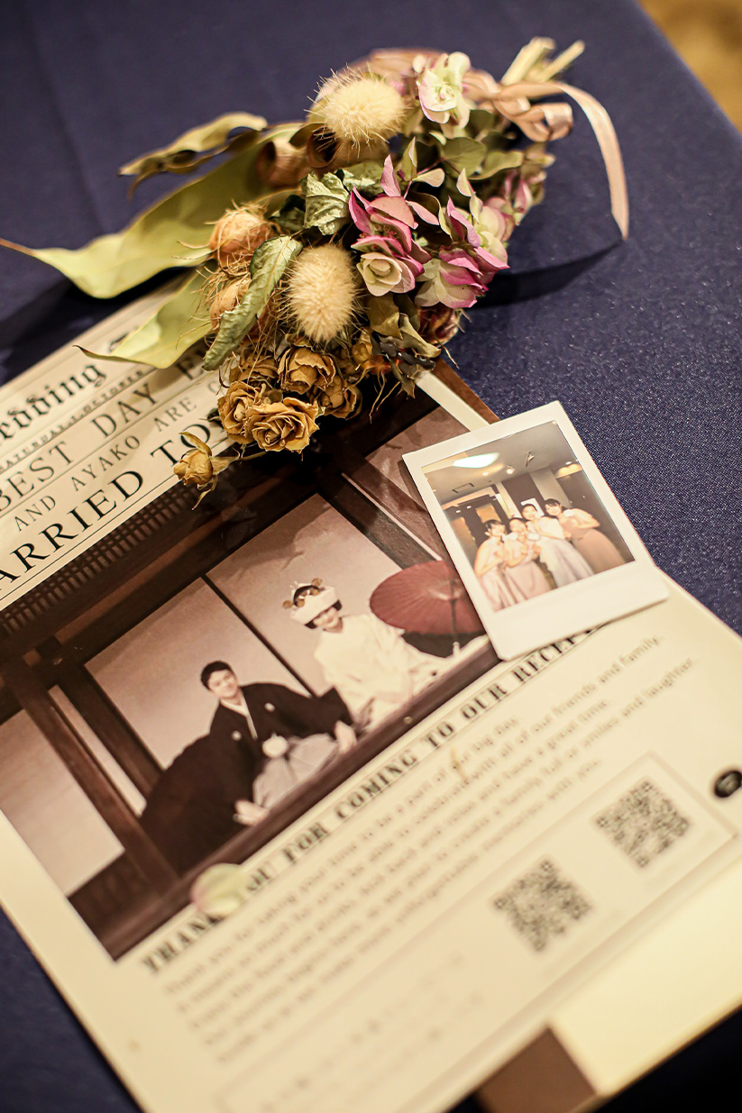 ウェルカムスペースは広く使用できたので、高校時代、大学時代など世代ごとの写真と衣装のオーナメントを飾り、ゲストテーブルには1枚ずつ手書きの手紙を用意しました。