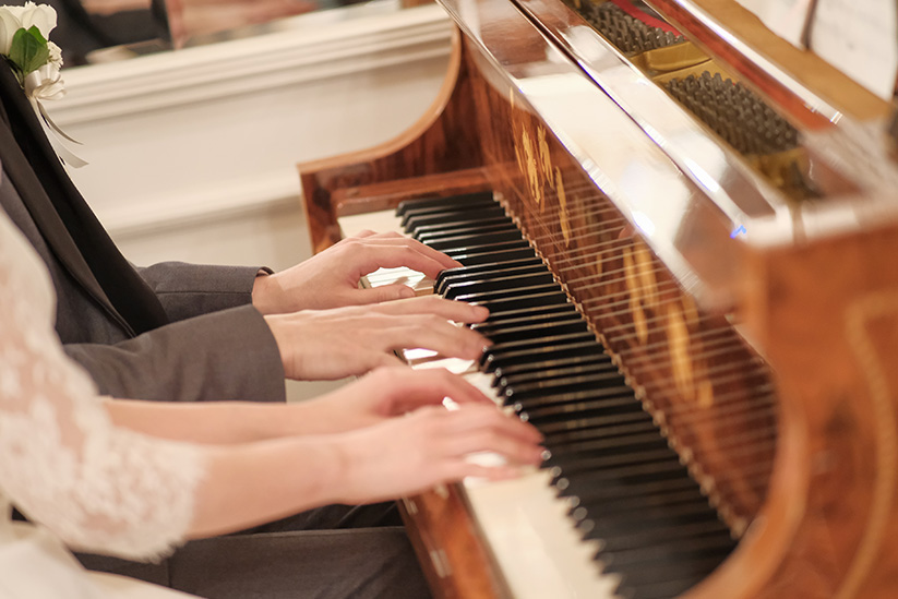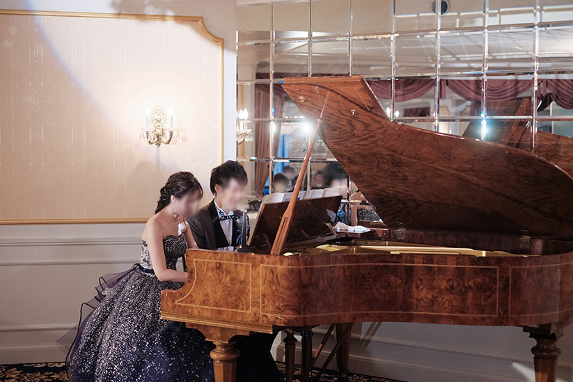 両親への手紙はきっと感極まって読めないだろうと思い、披露宴での朗読は行いませんでした。その代わりに、子供の頃にピアノを習っていたことから、感謝の気持ちを込めてピアノを連弾しました。