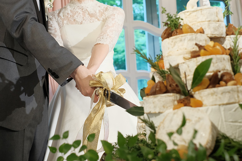 チーズが大好きなこと、ゲストにお酒好きが多いことから、カマンベールチーズを積み重ねてドライフルーツやハーブでデコレーションしたチーズタワーを作っていただきました。当日初めて目にした可愛らしいチーズタワーにとても感動し、ゲストからも好評でした。