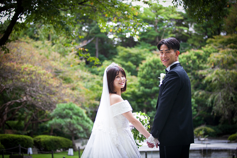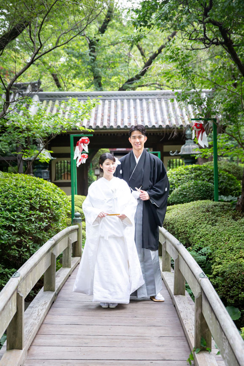立派な日本庭園があり、竹林や池、山門など様々な風景の中、挙式の雰囲気とは全然違う和のイメージで撮影することができました。