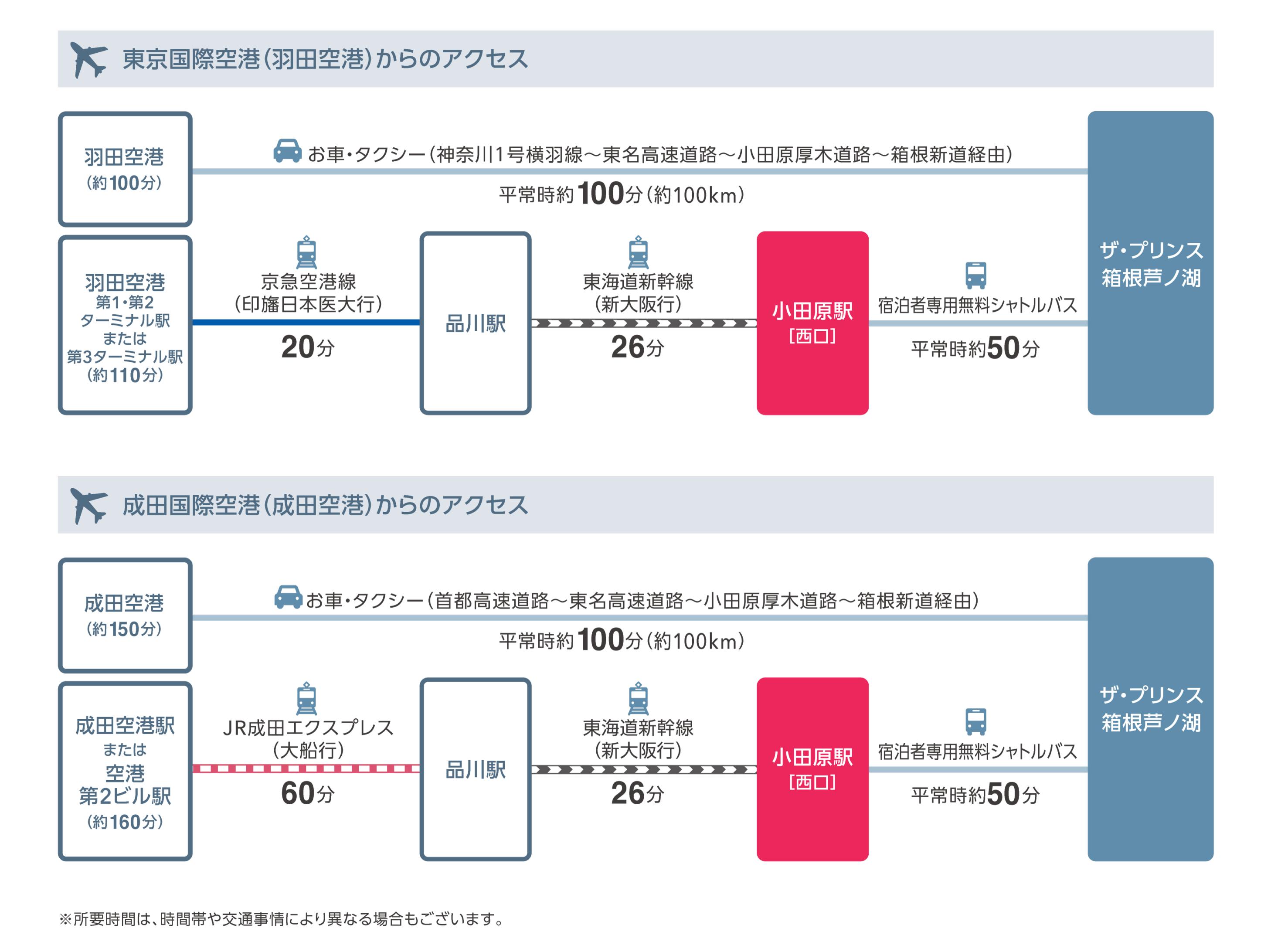 | 箱根湯本駅(1番のりば) | 「ザ・プリンス 箱根芦ノ湖」または「箱根園」(平常時約1時間5分、¥1,330) |