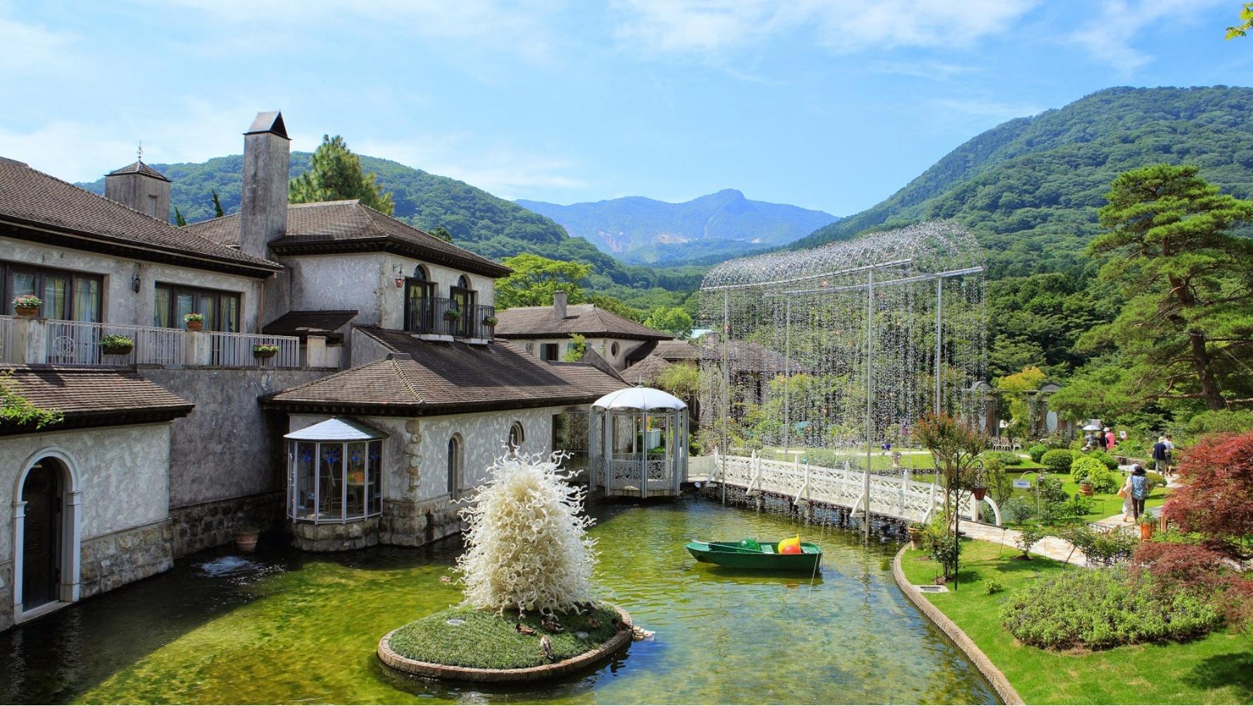 『箱根ガラスの森美術館』はヨーロッパの中世貴族が熱狂したヴェネチアングラスの名品、約100点を展示する美術館です。ヨーロッパ貴族の別荘を模した欧風庭園の広がる館内では、世界のガラス小物アンティークを販売するショップやイタリア人歌手によるカンツォーネの生演奏を行うカフェレストランで、お食事や喫茶をお楽しみいただけます。