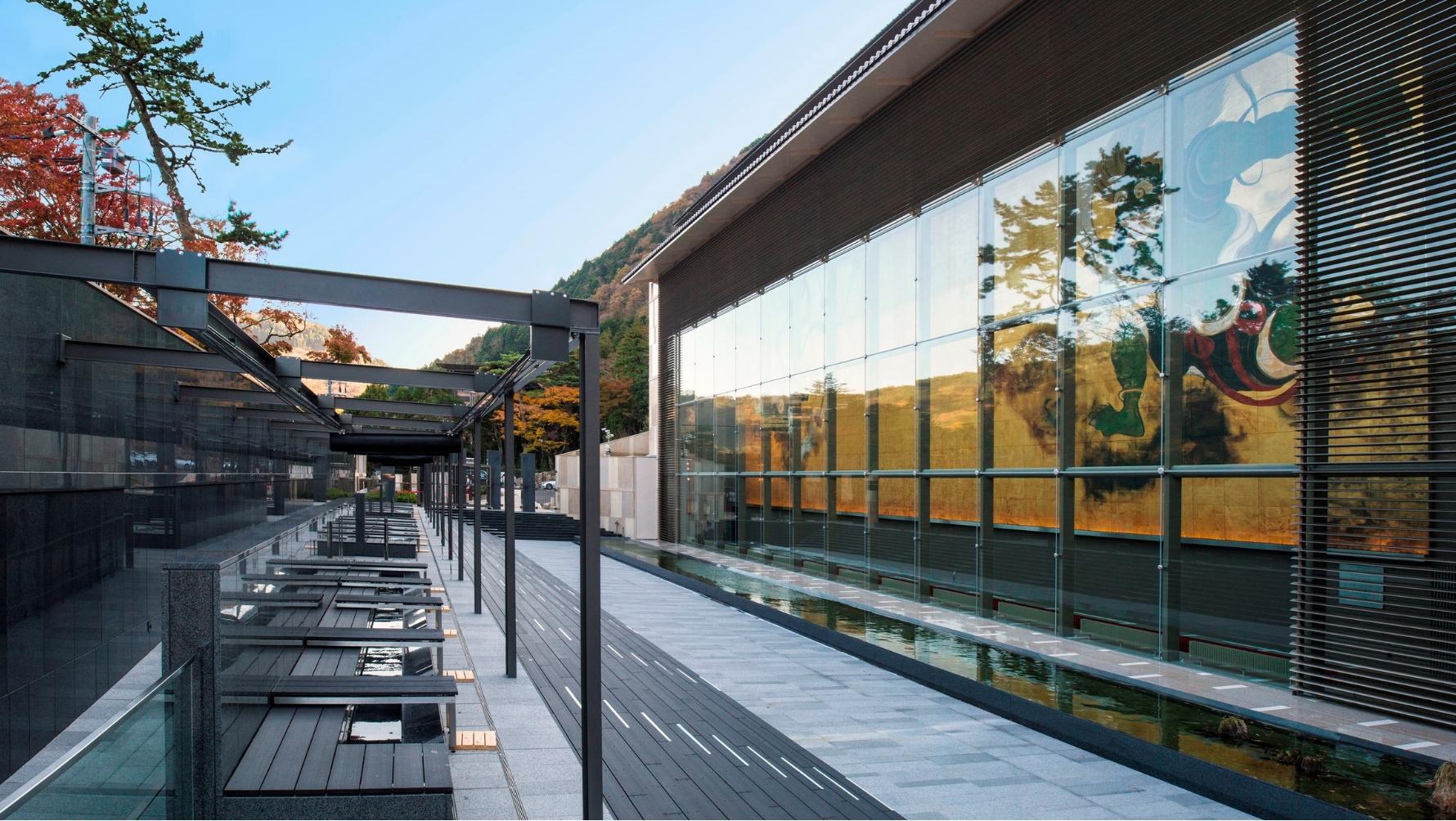 全5階から成る建物の延べ床面積は約7,700㎡で、展示面積は約5,000㎡にも及びます。この広い会場に、日本・中国・韓国を中心とする古代から現代までの美術品が展示されています。 100%源泉かけ流しの足湯カフェで鑑賞できる巨大壁画「風・刻(かぜ・とき)」(風神雷神図)は必見です。