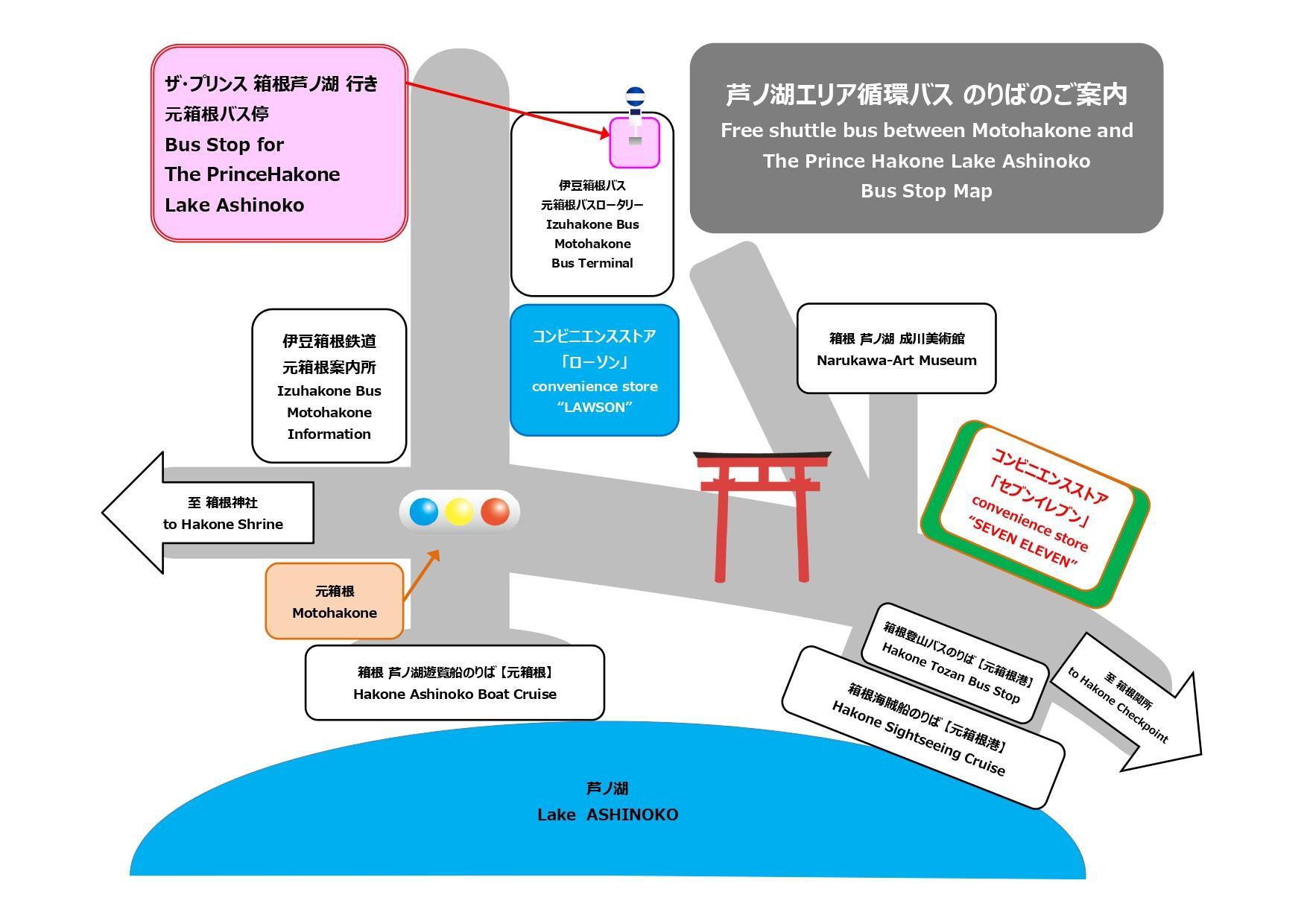 ※From The Prince Hakone Ashinoko to Moto-Hakone via Ryu Palace and Hakone-en. This is a free circulating bus that connects the hotel to Moto Hakone, where Hakone Shrine and a sightseeing boat ride are located.