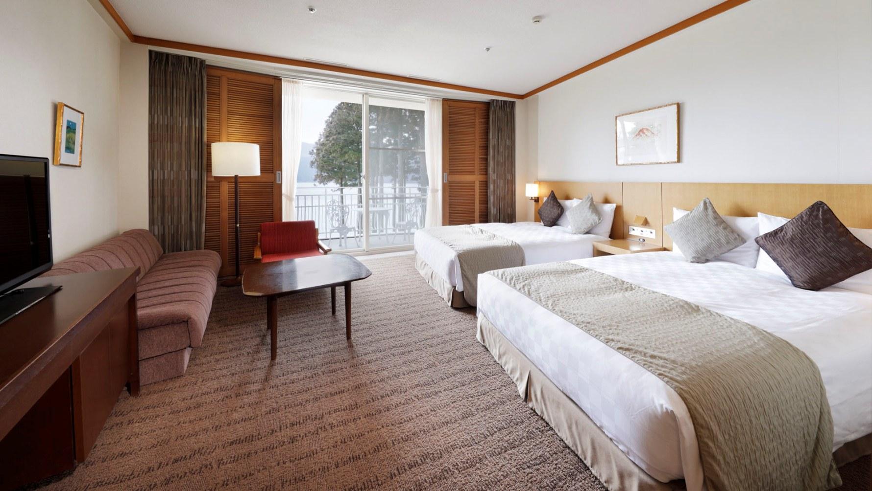 お食事の後は、ゆったりとくつろげる客室と、目の前に芦ノ湖が広がる露天風呂を備えた温泉「蛸川温泉 箱根 湖畔の湯」で、日々の喧騒を忘れてごゆっくりお過ごしいただけます。