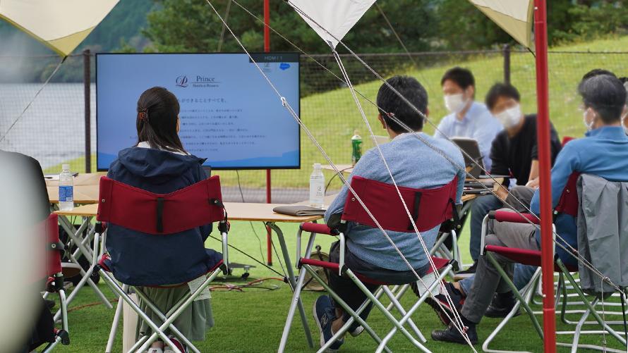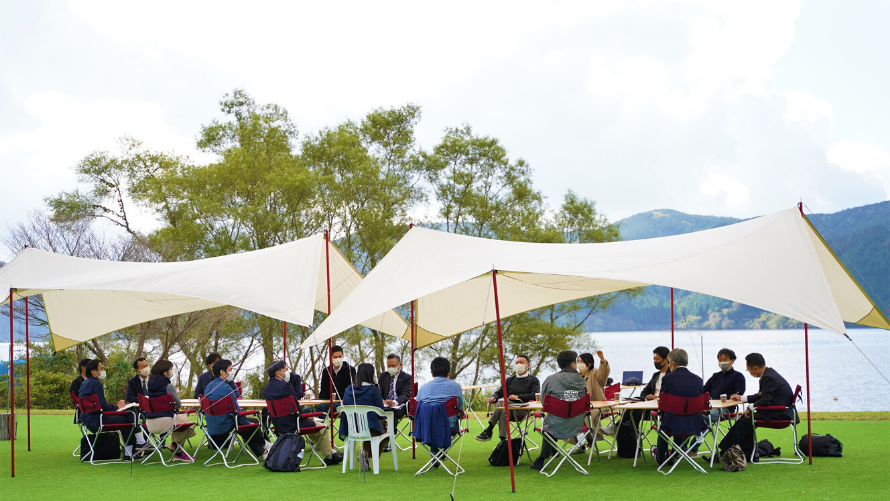 屋外で行うアウトドア会議では、オフィスでの会議とは違う開放的な気分でアイデア出しや意見交換を行い、普段なかなか意見が出ない方も自然と意見が出てきます。