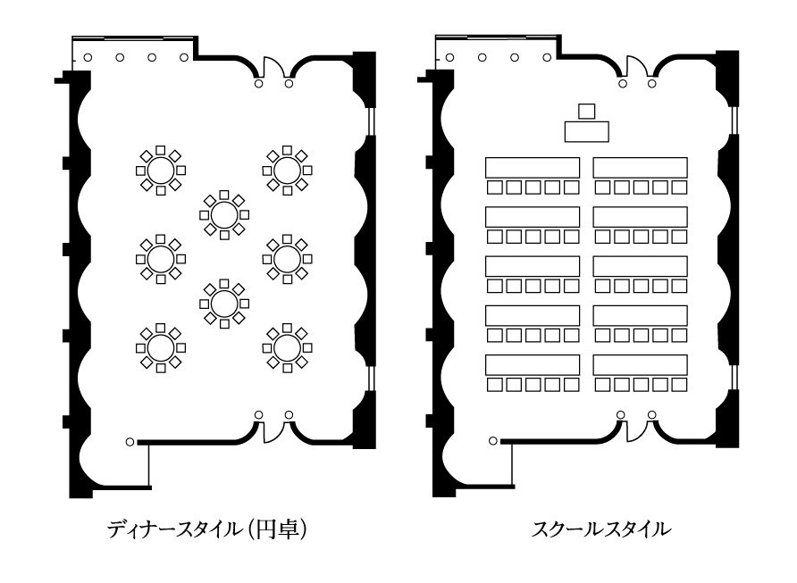 まばゆく輝く照明のバリエーションと、心を弾ませる美しいデザイン&カラーの床面とのコントラストが、華やかな宴を期待させる主宴会場。
