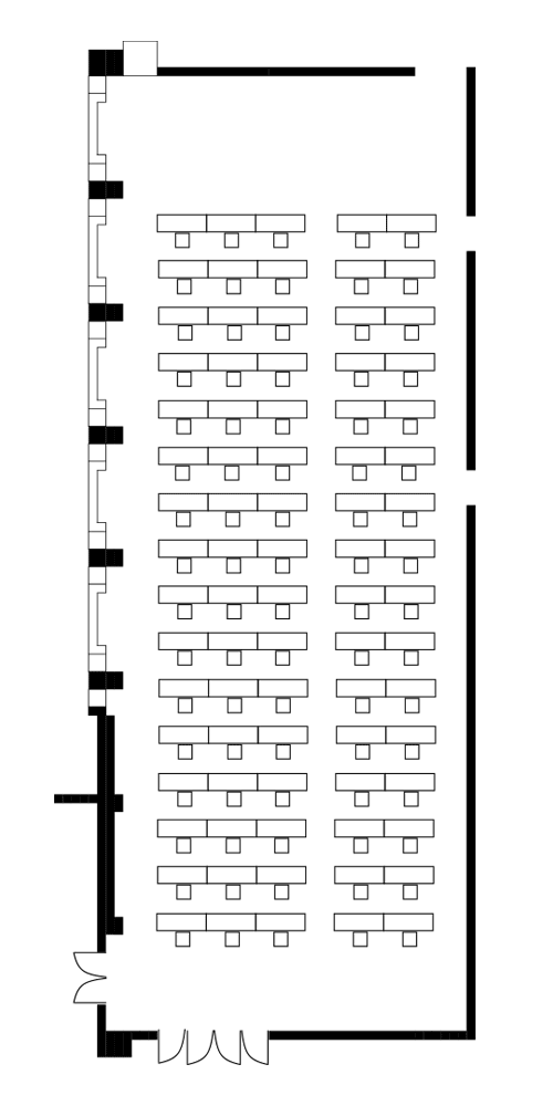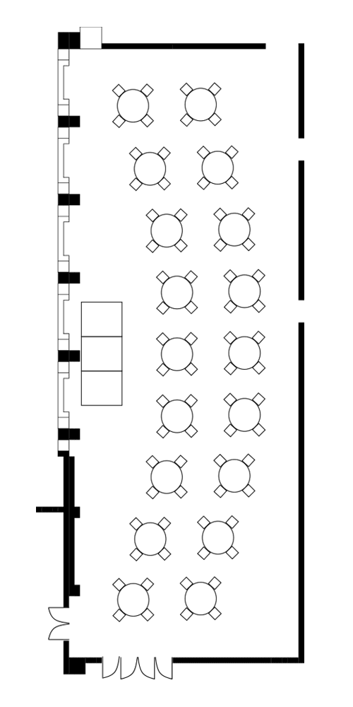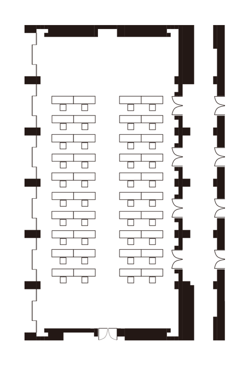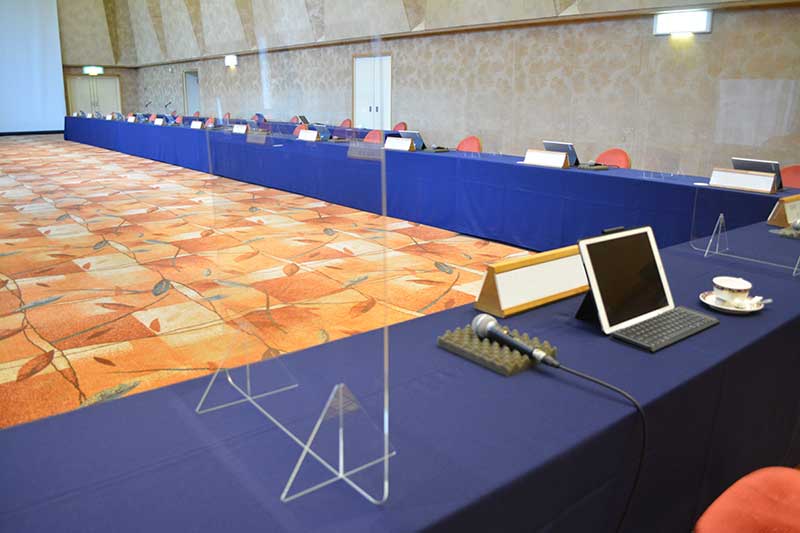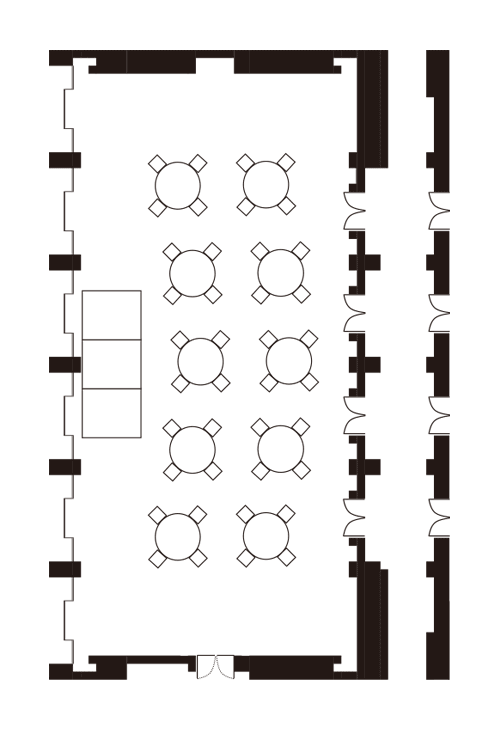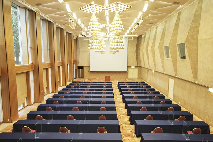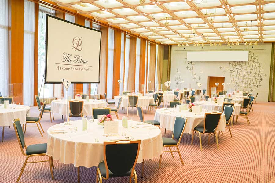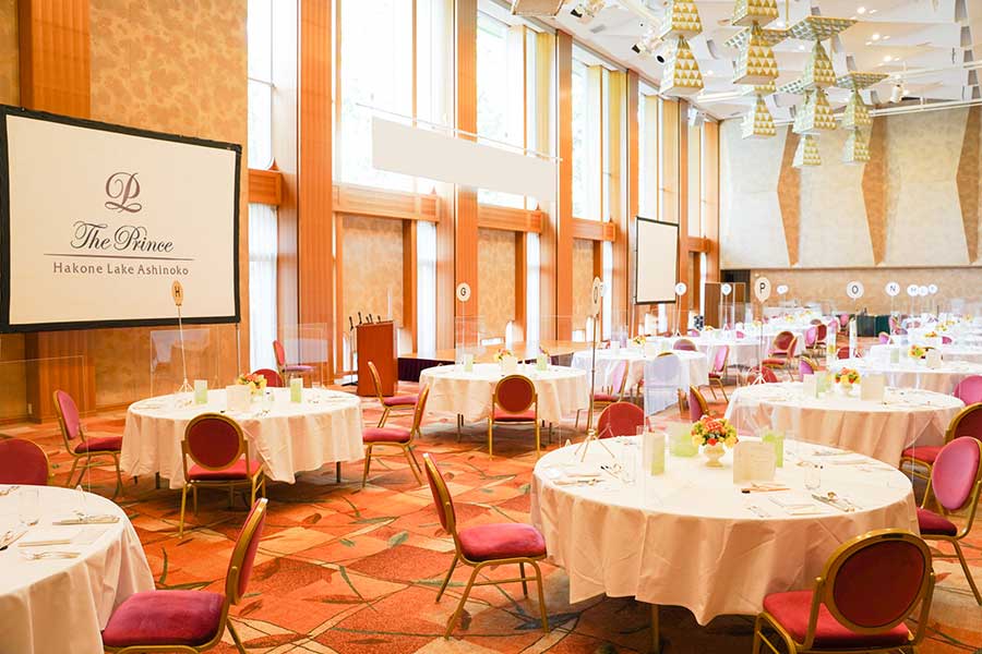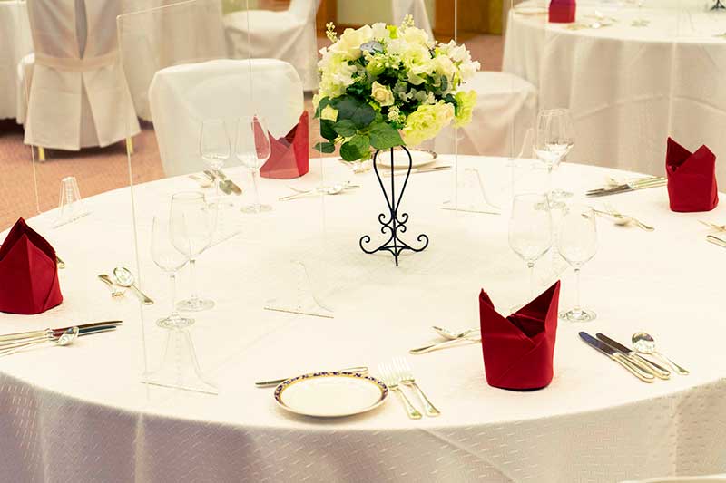 お客さまが快適なひとときを お過ごしいただけますよう 安全で清潔な環境を作り、 通常定員の50%以下を推奨し、 ソーシャルディスタンスを意識した 宴会場レイアウトをご提案いたします。