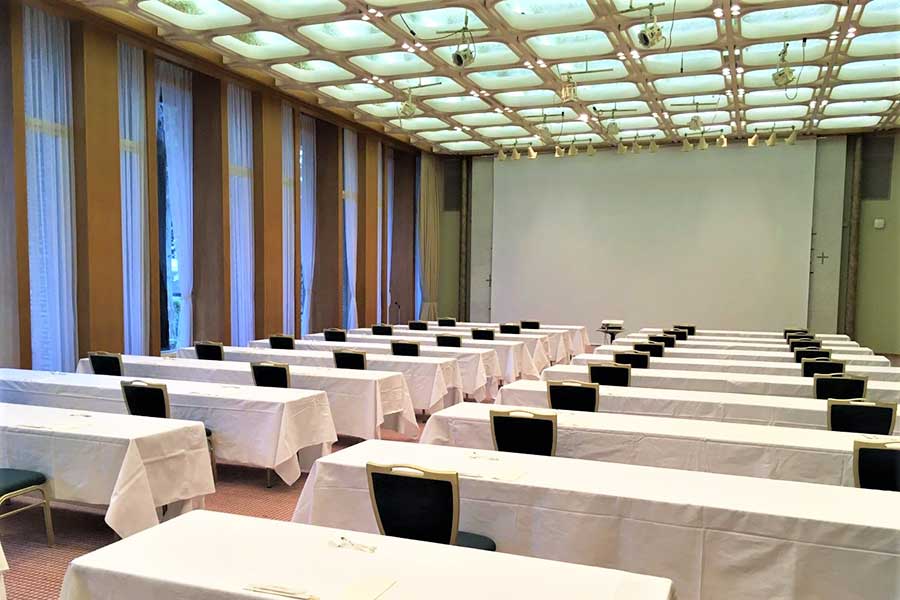 お客さまが快適なひとときをお過ごしいただけますよう 安全で清潔な環境を作り、通常定員の50%以下を推奨し、 ソーシャルディスタンスを意識した 宴会場レイアウトをご提案いたします。