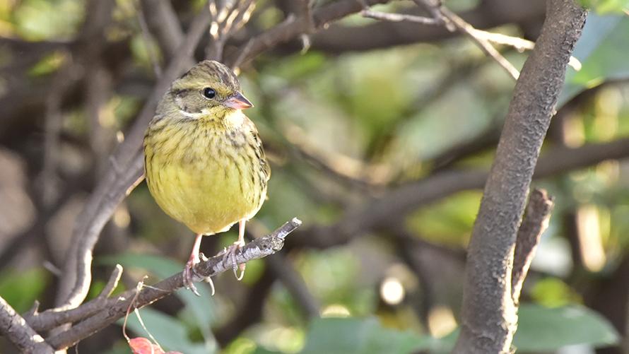 アオジ【渡】:お腹の緑がかった黄色が名の由来です(昔は緑も黄もアオといいましたとさ)。比較的低い樹木や茂みにいることが多い鳥で、エサを探しているときは地面で見られます。チッチッと鳴きます。