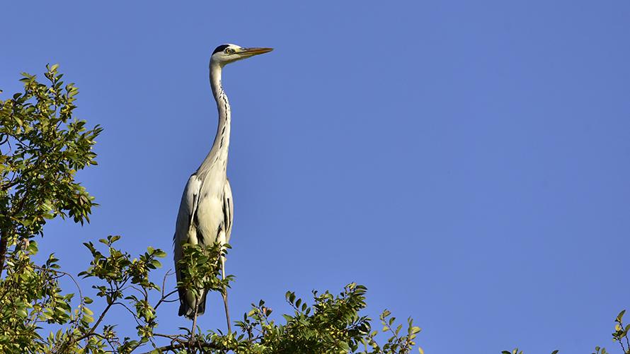 アオサギ【留】:日本で最大のサギで、市街地の河辺でもよく見かけます。背中は灰色、成鳥は首が白く頭の後ろに冠羽があります。長い首をZ字に曲げて脚を後ろに伸ばした姿で飛行しています。日本中で増加傾向にあり、芦ノ湖周辺でも増えています。