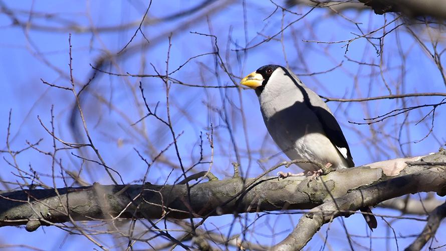 イカル【留】:灰色の体と青味のある黒色の翼・尾と頭。特徴は大きな黄色いくちばしです。キーコーキーと、澄んだきれいな鳴き声をしています。小群で見ることが多く、飛ぶときは翼の白斑が帯になって見えます。