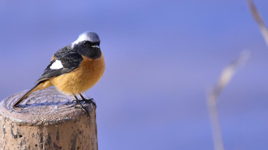 ジョウビタキ【冬】:尾っぽを上下にフリフリしながら、ときどきお辞儀のような動作をします。開けた場所に出てきてくれるので見かけやすい鳥です。