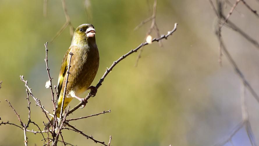 カワラヒワ【留】:褐色の体、翼と尾には黄色の斑があり、飛ぶときに黄斑が目立って見えます。キリリリと高い声で鳴きますが、少し濁った声でビィ―ンの声も出ます。繁殖した後は草地の広い河原で見られることが多いので、カワラヒワと呼ばれています。住宅地や公園でも見かけることがあります。