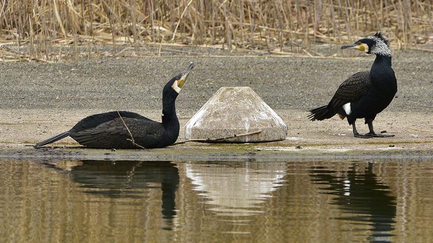 カワウ【留】:水辺の樹上に集団で留まっている姿を見かけます。ガチョウほど大きく、全身ほぼ黒色の鳥です。この写真ではわかりませんが、青い目が特徴的です。泳ぐときは体を沈めて泳ぐので、頭しか見えないような感じになります。鋭いくちばしで水中の魚を捕らえ、水面に運んで飲み込みます。集団で飛ぶときは鉤(カギ)になり飛行します。