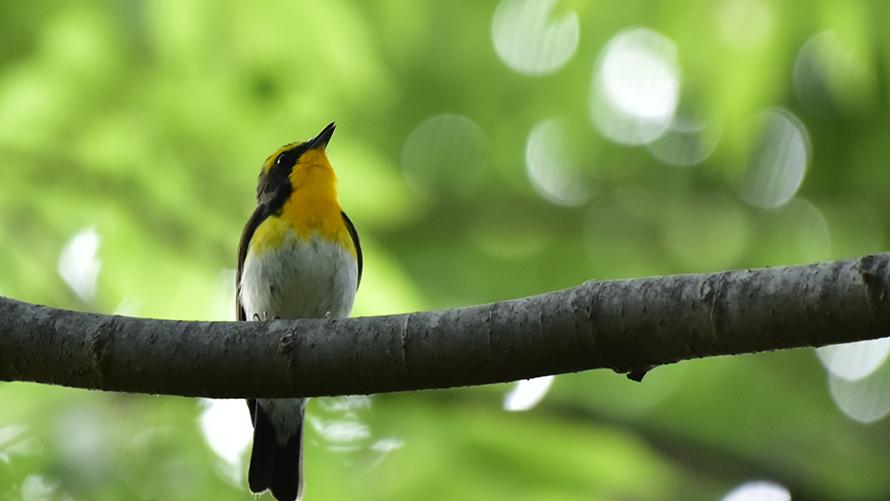 キビタキ【夏】:黄色、黒、白の体が美しく、さえずりも高いきれいな声で、見かけるとテンションが上がる鳥です。。夏になると見かけることができます。