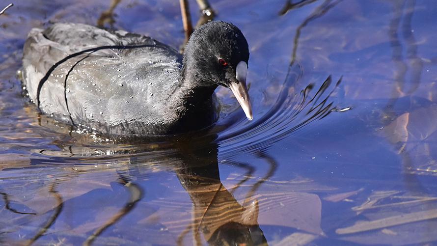 オオバン【冬】:こちらは「クイナ科」の水鳥です。全身灰黒色で、額からくちばしにかけて白です。茶褐色の目がちょっと怖い。。。