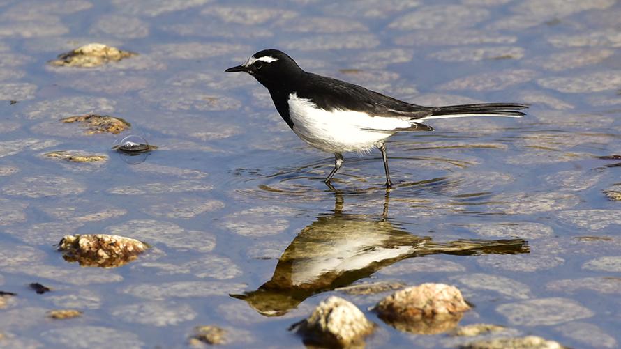 セグロセキレイ【留】:日本固有のセキレイで、背中が真っ黒なのでハクセキレイと見分けられます。生息地や尾っぽを上下にフリフリする動作はハクセキレイと同様です。ハクセキレイの方が繁殖力が強く、ハクセキレイとの軋轢で個体数を減らしているといわれてます。