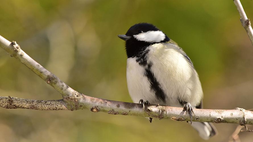 シジュウカラ【留】:白い頬に黒いネクタイのような模様、その姿はまるでサラリーマンです。雌に比べて雄の方が太いです。いち早く春を告げる鳥で、ツツピーツツピーと鳴きます。また、「カシャカシャカシャ」と、連続シャッター音のような鳴き方もします。