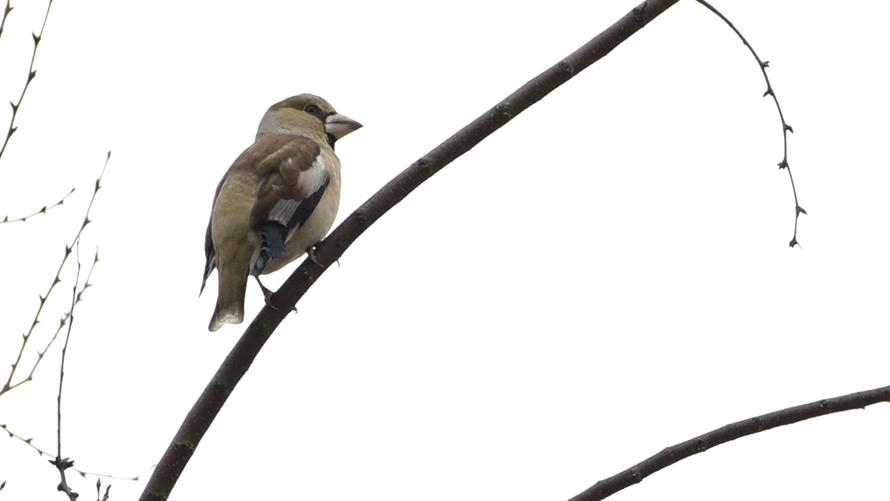 シメ【冬】上のアトリさんのお仲間です。くちばしが太くずんぐりむっくりとしています。単独で樹上にいるところを見ることができます。渡りの時は群れになるとのこと。