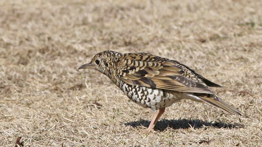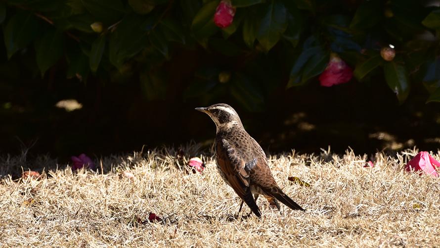 トラツグミ【留】:ツグミよりも大きく、虎ふ模様が特徴的です。かつてはヌエ(鵺)と呼ばれた鳥で、夜中に「ヒューーッ」と高い気味悪い声で鳴きます。開けた場所に出てきてエサを探す姿が見られます。