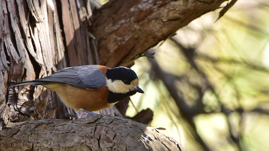 ヤマガラ【留】:ちょっと頭でっかちで尾っぽが短く、かわいらしさを感じます。お腹は少し赤味のある褐色、顔は黒白、羽は灰色。ヒナには虫やその幼虫などをあげますが、堅い木の実も食べます。コツコツと木をたたく音がするとこの鳥の事があります。さえずりはツツピーン・ツツピーンと、他のカラ類よりゆっくりと鳴きます。