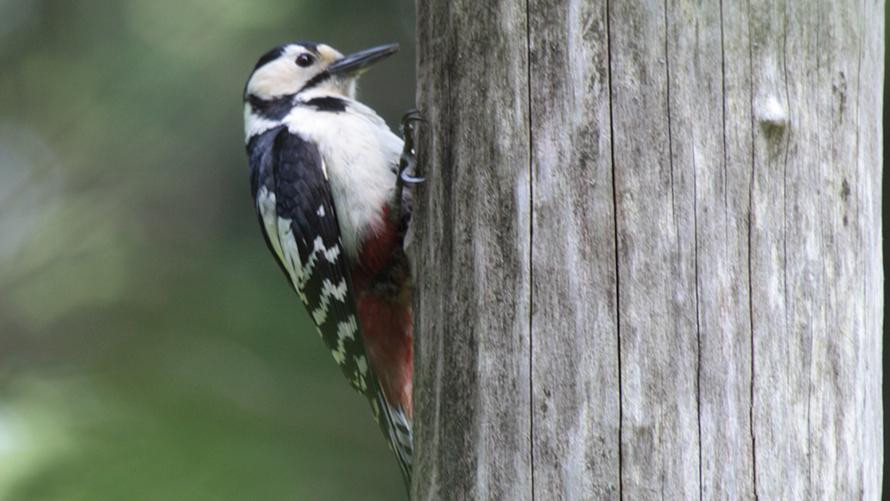 アカゲラ【留】:キツツキの仲間です。黒い背中に白い縞模様、赤い尻が目印。太い指としっかりとした爪に折れにくい尾羽で体を支え、木の幹に縦に止まることができます。