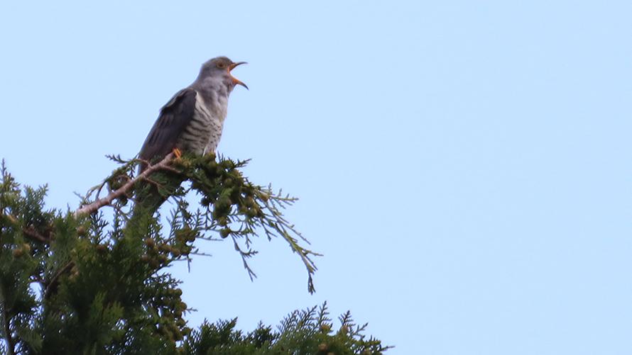 ホトトギス【夏】:初夏になると「テッペンカケタカ」と特徴的な鳴き声が聞こえてきます。ウグイスの巣に卵を産み、育ててもらうずるい鳥で、その習性も、見た目も、カッコウに似ています。植物にもホトトギスがありますが、花の模様がこの鳥の腹の模様に似ていることからその名です。