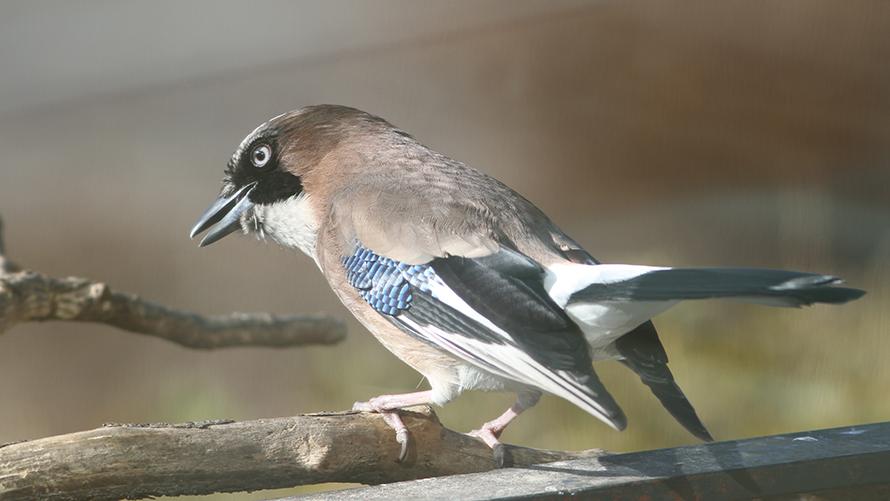 カケス【留】:暗褐色の体、黒色の尾と翼と少し目立たない色のように感じますが、翼の一部にある青と白の縞模様が見分けポイントです。カラスの仲間で、他の鳥の声や機械音の真似が得意です。