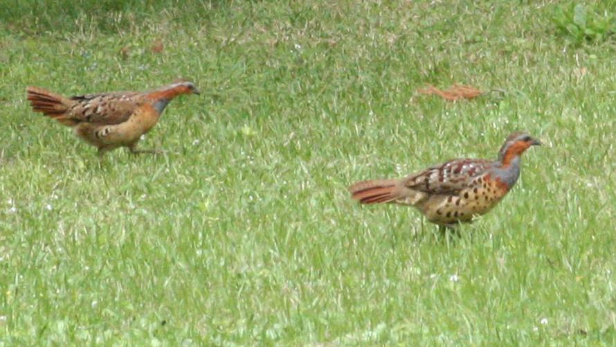 コジュケイ【留】:中国中南部原産(外来種)のキジの仲間です。鳴き声の「ビィッググイ ビィッググイ」を「チョットコイ」と聞きなすことで知られています。丸っこい体は胸あたりが赤褐色に灰色の斑があります。茂みから突然飛び出し高速で走り、茂みに消えていく姿を見かけます。