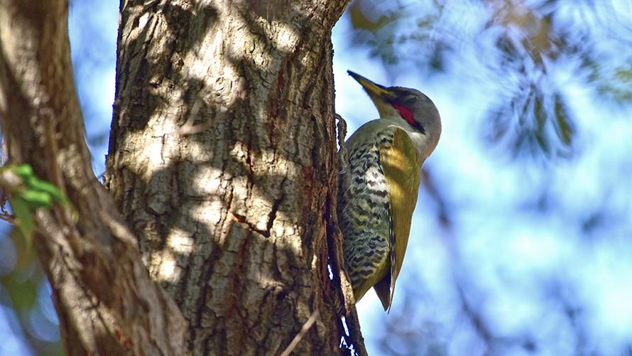 アオゲラ【留】:日本特産種のキツツキです。体は暗緑色、腹には横じま模様があり顔の横には赤い斑があります。繁殖期にはピョーピョーピョーと大きな声で鳴きます。