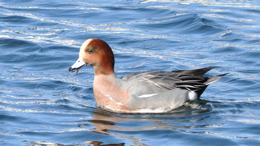 ヒドリガモ【冬】頭が緋色(ヒイロ)なのでヒドリガモ。モヒカンのような頭のラインが特徴的。