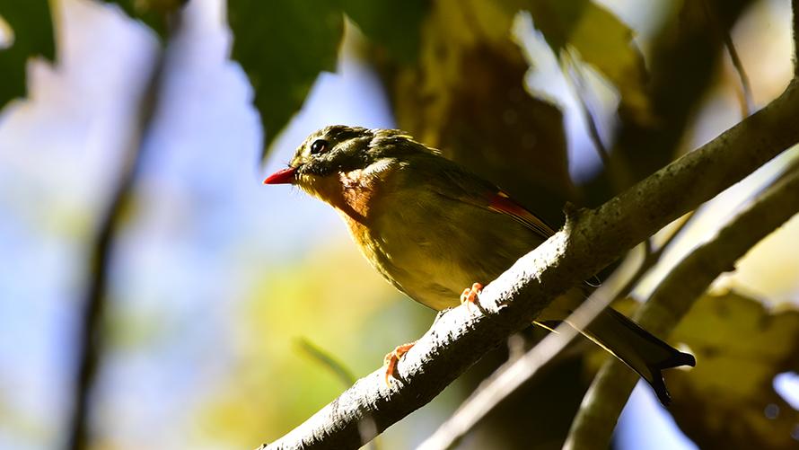 ソウシチョウ【留】:体も、鳴き声も美しい鳥ですが、特定外来生物に指定されています。ペットとして中国から輸入されたものが逃げ出し繁殖しました。ウグイスなどとの軋轢が心配されます。比較的よく見かける鳥です。