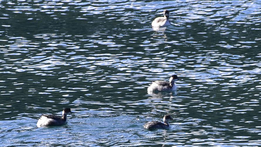 ハジロカイツブリ【冬】:この写真だとわかりませんが、濃いオレンジ色の目が特徴的です。潜水が得意な鳥で、群れでゆったりと浮かんでいると思ったら、みんな同じタイミングで潜るので、「群れが消えた!」って感じです。しばらくすると、ぴょこっ ぴょこっと、また水面に浮かんできます。カモの仲間ではなく「カイツブリ科」です。